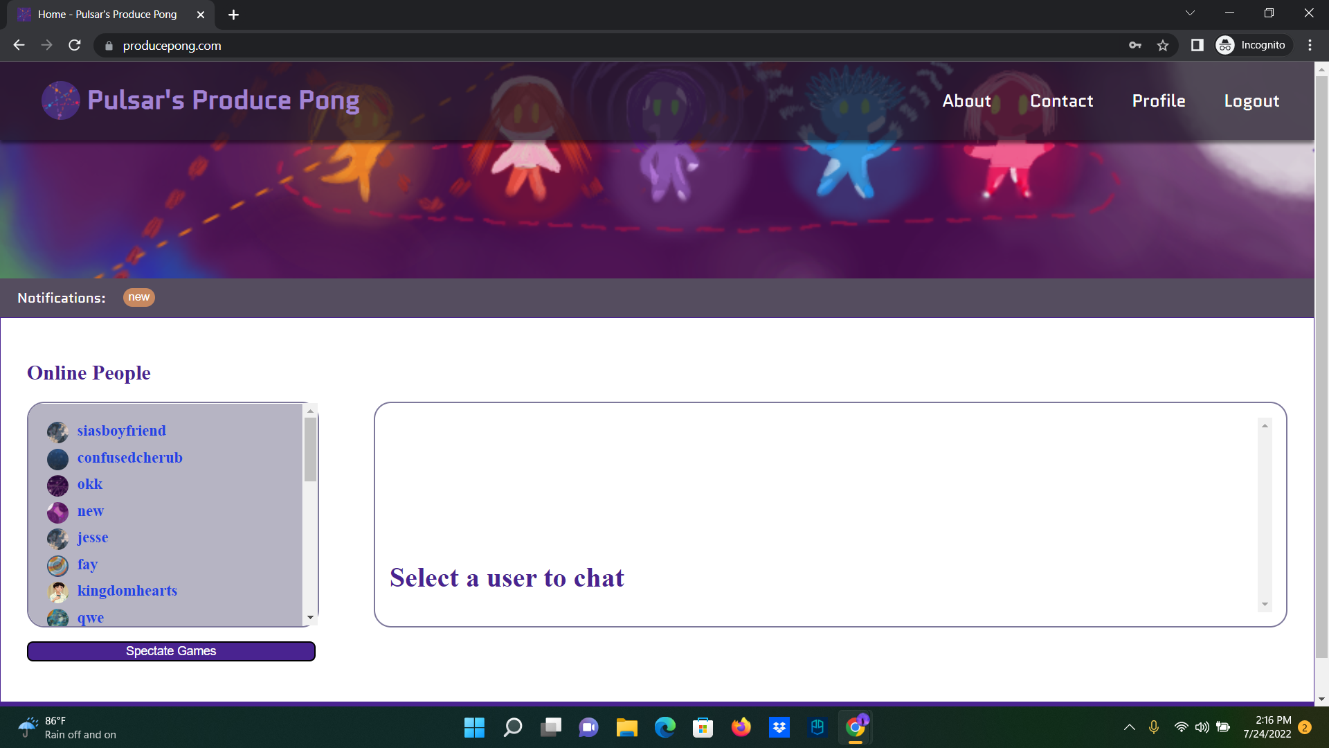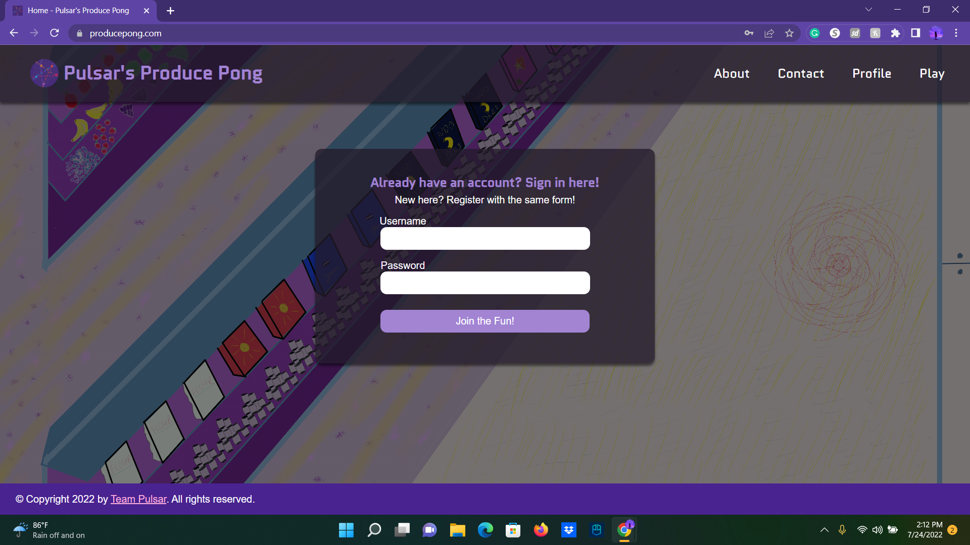 Even if it wasn’t a front-end focused class, we wanted it to look presentable. Something that could be enjoyed even out of class. We decided to take the lovely original Pong and add a twist to it. Pulsar’s Produce Pong is where you compete to make the best dishes, and you get achievements for the dishes you succeed in making as well.